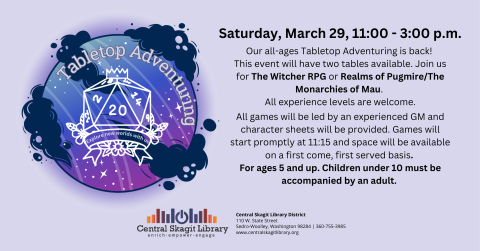 This event will have two tables available. Join us for The Witcher RPG or Realms of Pugmire/The Monarchies of Mau.